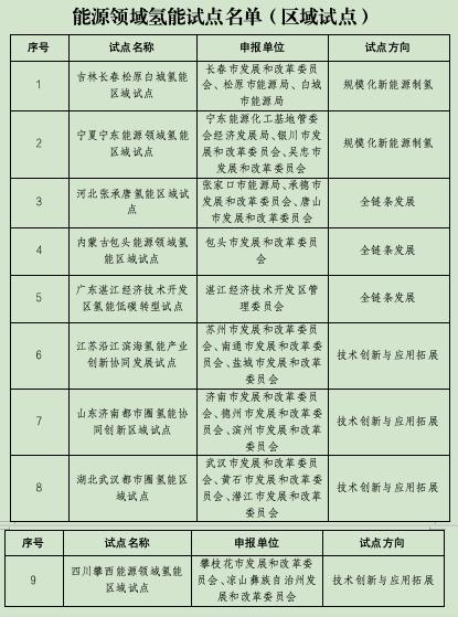 第一批9个国家能源领域氢能区域试点,分别位于吉林、宁夏、河北、内蒙古、广东、江苏、山东、湖北和四川。