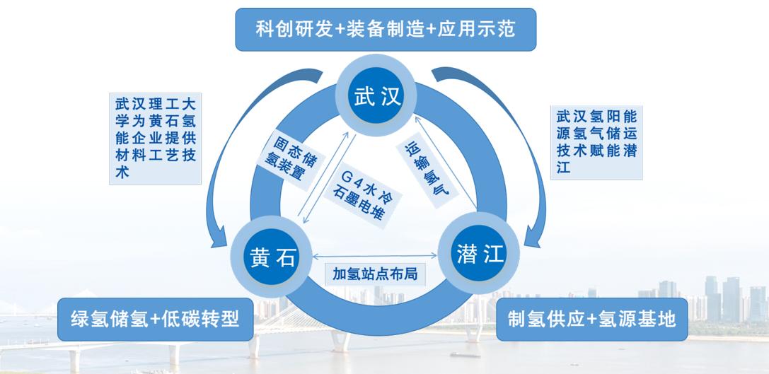 根据《武汉都市圈氢能区域试点申请报告》,武汉、黄石、潜江立足三市资源禀赋,聚焦“技术创新与应用拓展”方向,构建“一核两翼双走廊”空间格局。《申请报告》明确武汉“科创研发+装备制造+应用示范”,黄石侧重“绿电制氢+深地储氢”,潜江着力“氢源供给+盐穴储氢”的功能定位。