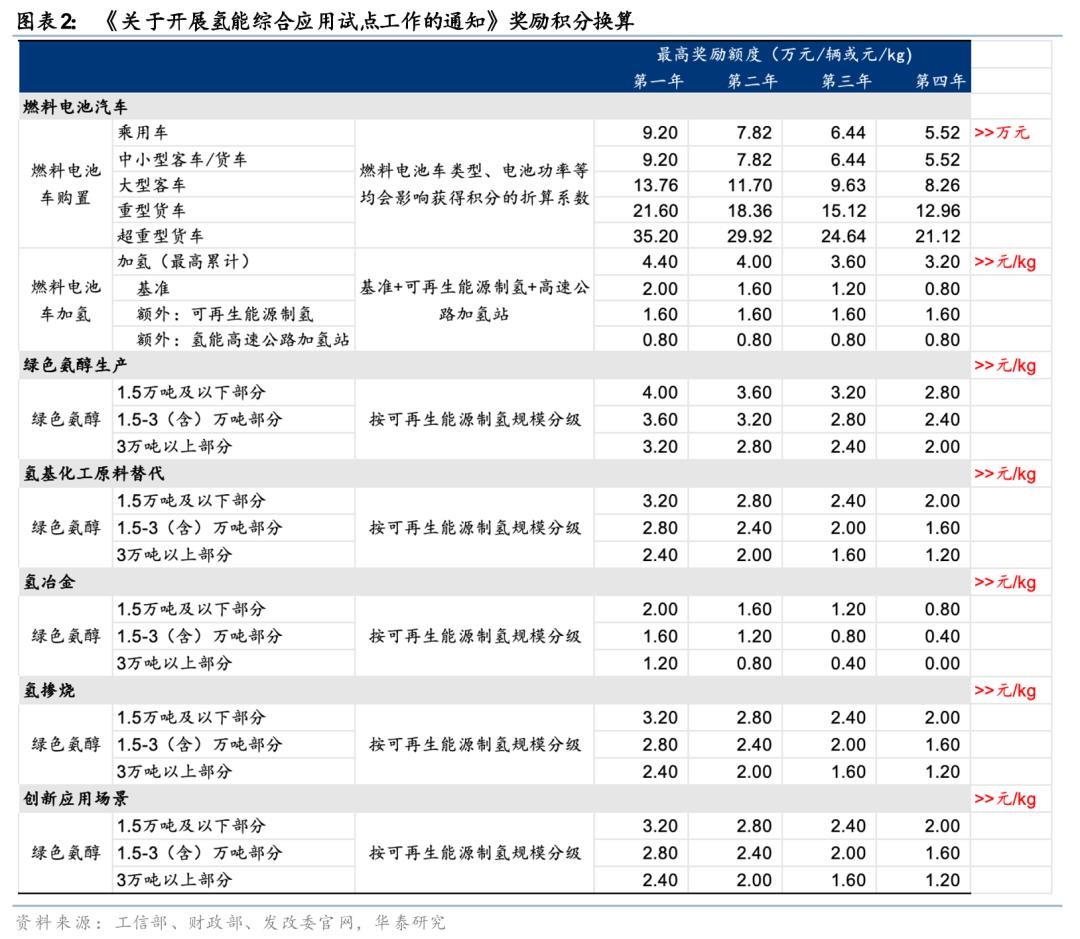 2. 经济性驱动属性加强:各类应用场景的终端用氢价格原则上不高于25元/kg,燃料电池车部分优势地区力争降至15元/kg,相较于2020年政策提出的燃料电池汽车终端用氢价格不高于35元/kg目标收紧。政策通过“以奖代补”给予资金奖励,我们测算,燃料电池车加氢、绿氢生产、氢化工、氢冶金、氢掺烧分别最高可获得2-4.4元/kg氢奖励不等。