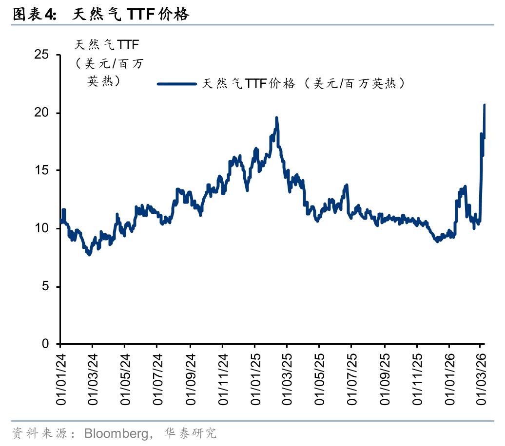 2026年全球碳排管控持续加码。IMO净零框架将于26年10月重新投票,若通过则Tier2/Tier1目标下2030年全球船运相比基准减排幅度需达8%/21%,此外欧盟航空业免费碳配额于2026年完全取消,强化绿氢作为低碳燃料的经济性。海外绿氢应用渗透主要对标传统油气体系,截至3月16日,布伦特原油、欧洲天然气基准TTF价格已上涨至103美元/桶、17美元/百万英热,较1-2月平均上涨40%+,传统化石能源成本抬升正在重塑绿色燃料的平价曲线,我们测算:1)船用绿色甲醇及航空可持续燃料SAF相对传统船用燃料油、传统航油的平价点对应的原油成本为108、124美元/桶;2)氢化工-制绿氨、氢化工-制绿醇、氢冶金(气基竖炉)相比传统天然气路径平价点对应的天然气成本为18.0、20.7、22.1美元/百万英热。